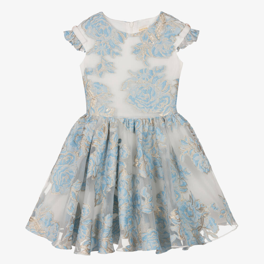 Light blue dress for girls by British brand David Charles, ideal for special occasions. Woven in luxuriously soft floral brocade with an elegant gold shimmer, it has cute capped sleeves and lovely shoulder bows for a feminine finish. The back of the dress fastens with a concealed zip fastening for a chic, seamless fit. It has a silky and lightweight lining, providing little girls with comfort and added volume.
