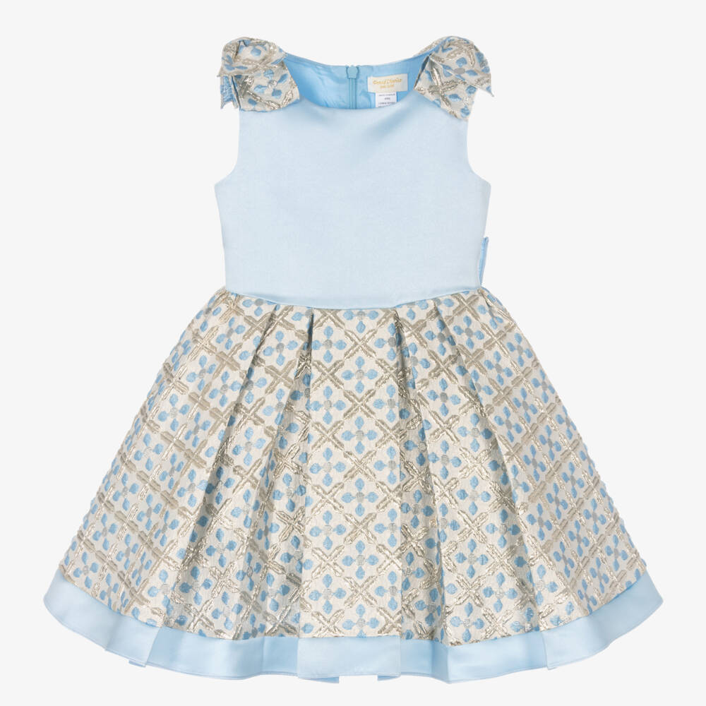 Gorgeous pale blue special occasion dress for girls by British designer David Charles. It is made in sumptuous satin and brocade, embroidered with shiny gold and pale blue thread. There are fixed brocade bows on the shoulders, matching the full, pleated skirt. The silky lining has gathered tulle frills around the hemline for extra swish and volume. The dress fastens with a neat, concealed zip around the back, with ties that fasten in a large bow.