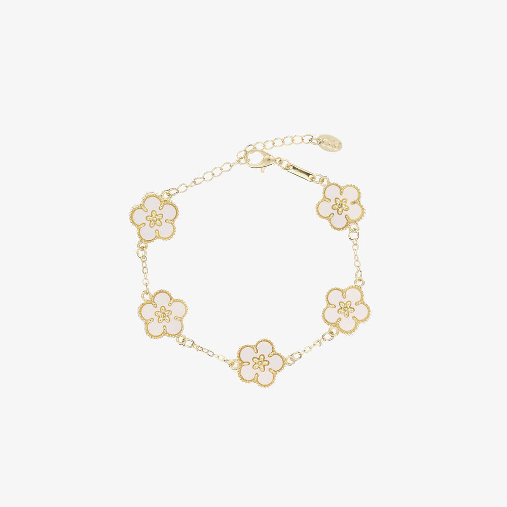 From David Charles, a gold chain bracelet for girls. Fastening with a lobster clip for a secure fit, this lovely piece features five ivory flowers for a pretty finish.