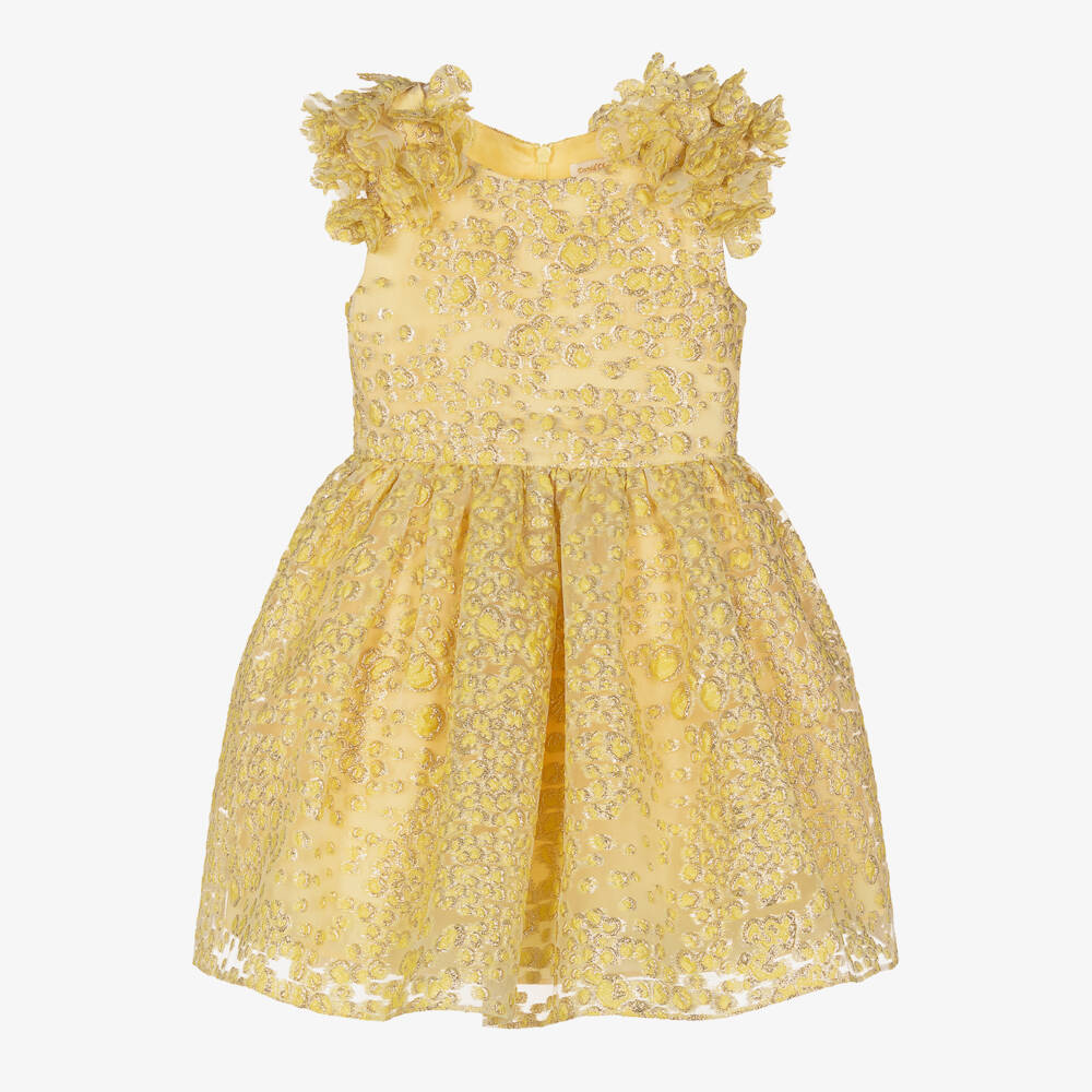 A stunning yellow and gold special occasion dress for girls by British brand, David Charles. It is made from organza brocade with golden thread detailing for extra sparkle. This sleeveless design has beautiful flower appliques on both shoulders, a large bow on the back and a gathered skirt. It is fully lined for comfort with a netting trim around the hem for added flare and volume. It neatly fastens with a zip on the back.