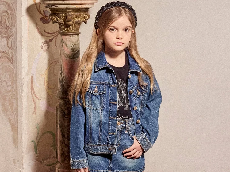 الموسم الجديدRoberto Cavalliجاكيت دنيم مزين بالكريستال لون أزرق للبنات