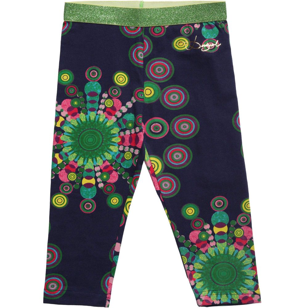 Girls navy blue cotton jersey leggings by Desigual with a bright circular 'galactic' and floral print and a green glittery elasticated waistband for comfort. In a shorter length they sit between the calf and the ankle.