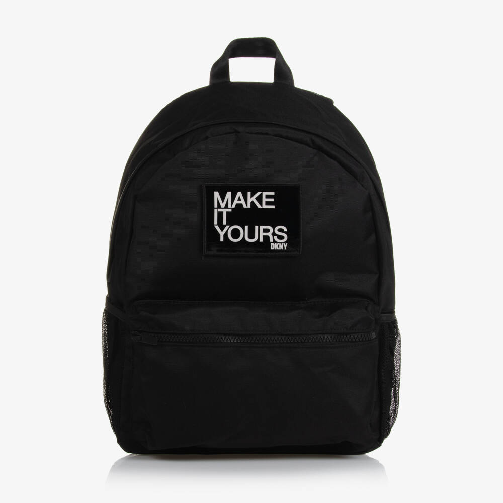 Black backpack for boys and girls by DKNY, made from durable canvas. It has a bold velcro patch on the front with a white slogan that reads 'Make it Yours'. It comes with an alternative logo patch which can be repositioned for a different look. It has a zip pocket on the front, mesh pockets on the sides, and interior pockets inside the zipped main compartment. The mesh back is embossed with the brand's name and the lightly padded straps are detailed with white, repeating logos. They can be adjusted easily for comfortable wear.
