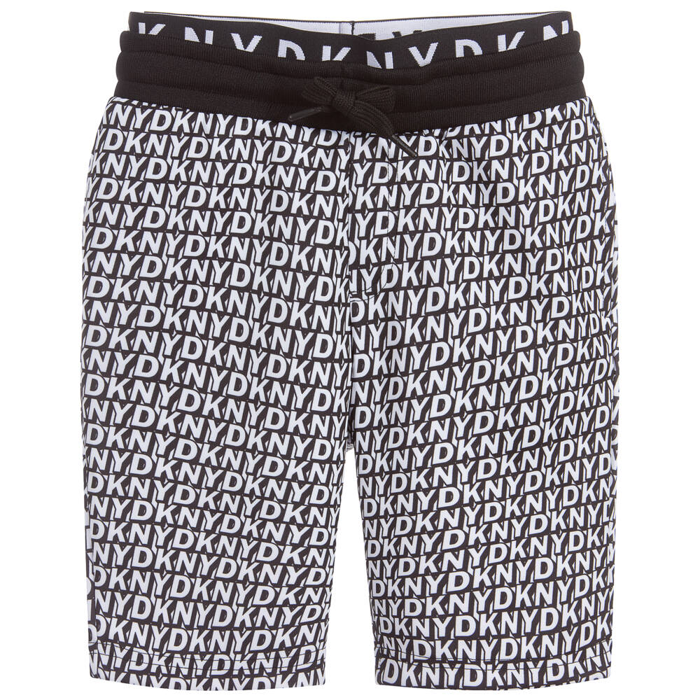 Boys neoprene jersey shorts by DKNY, with an all over black and white logo print. The drawstring waistband has a wide, elasticated band in black with white branding.
