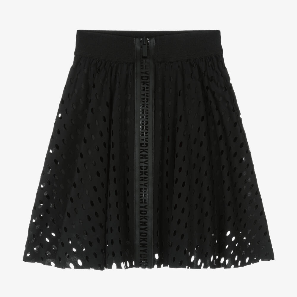Black midi skirt for girls by DKNY, made in silky jersey fabric with a quirky perforated pattern. It has a black vinyl logo tape zip down the front, with raw edges around the hem. The lining is made in silky-smooth jersey, and the waist is gently elasticated for a comfortable fit. For a fun effect, the skirt is slightly longer than the lining.