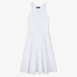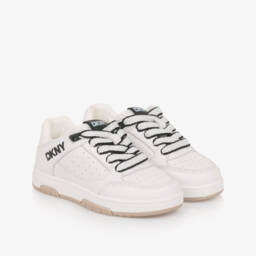 Off-white trainers for girls by DKNY, made in mesh and faux leather. Inspired by the adult's collection, these slip-on shoes have metallic silver accents with signature DKNY branding. They have a comfortable textile lining and a smooth faux leather insole. The rubberised outsole provides grip.