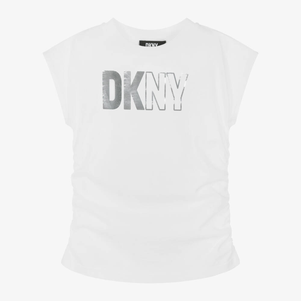 A white T-shirt for girls by DKNY, made from soft organic cotton jersey. Printed with a metallic silver logo design on the chest, it has ruched elasticated detailing on the side seams for a feminine take on a casual look. Complete with seamless short sleeves, this top is comfortable to wear.