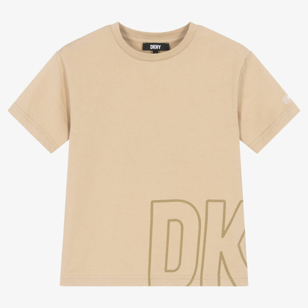 DKNY muted beige cotton T-shirt for teen boys and girls. Relaxed and oversized, this casual tee has a tonal logo print wrapped around the hem. A small rubberised logo badge finishes off one sleeve for subtle branded detailing. It is made in soft cotton jersey for everyday comfort.