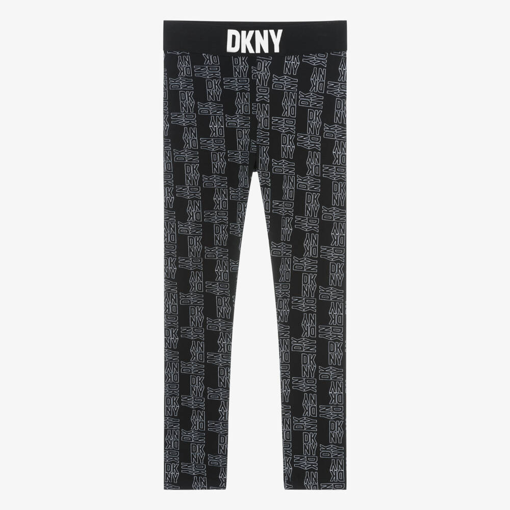 Full length black leggings for teen girls by American designer DKNY, making a designer statement with an all-over white logo pattern. Endlessly comfortable and ideal to wear with a top or layered with a dress, they are made in soft cotton jersey with an elasticated waistband, that has a large white rubberised logo.