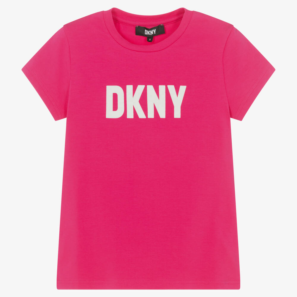 Fuchsia pink organic cotton T-shirt for teen girls by DKNY, inspired by the brand's logos. Easy to wear and versatile, it has a bold white logo print across the front for an instantly recognisable look.