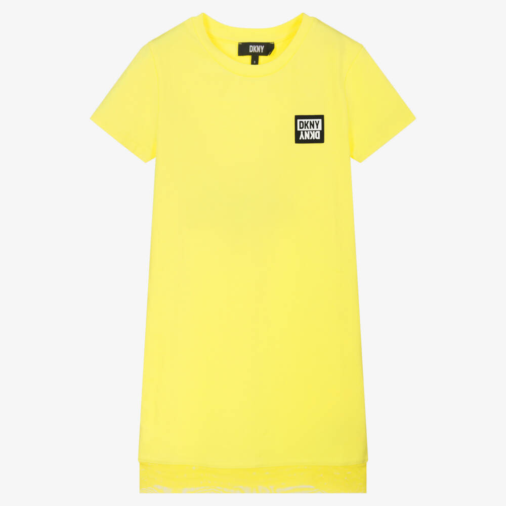 Casual yellow T-shirt dress for teen girls by DKNY, made in soft cotton jersey. It has trendy capped sleeves and a rubberised black and white logo patch on the front.