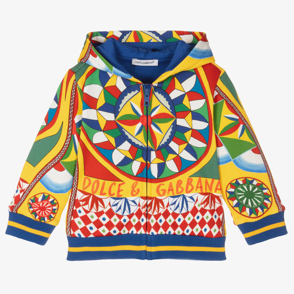 This colourful cotton zip-up top for baby boys is an unmistakable style from Italian label Dolce & Gabbana. Fun and vibrantly patterned, the luxury brand has designed this comfortable hoodie with iconic Carretto and logo prints in yellow, blue, red and green. Made in soft, mid-weight jersey fabric, it has an easy-to-use front zip and striped trims for that sports-luxe look.
