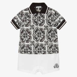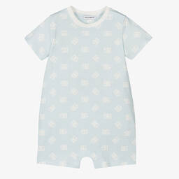 Ivory and beige shortie for baby boys by luxury Italian brand Dolce & Gabbana, made in soft and lightweight linen. Designed to look like a dungaree shorts and shirt set, this cute babysuit has slanted front pockets, short sleeves and faux shoulder straps. There are button and popper fastenings on the front and poppers between the legs to help with dressing and nappy changes. A beige embroidered logo on the hip adds a subtle designer finish.