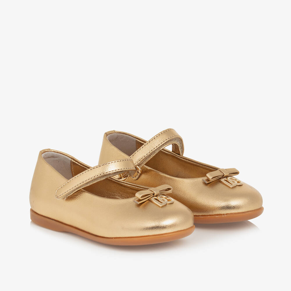 Shimmering gold ballerina pumps for baby girls by renowned designer Dolce & Gabbana. Lovely for smart or casual styling, they have dainty bows and golden DG branding on the front. The upper, insole and lining are soft leather, luxuriously comfortable for growing feet. The velcro straps ensure they are easy to put on and the rubber sole is treaded for safety.