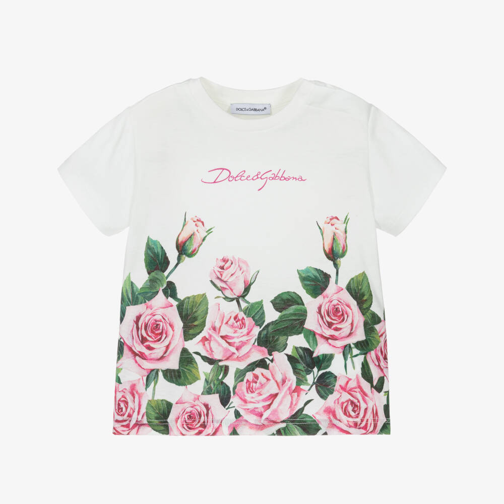 Ivory short-sleeved T-shirt for baby girls by luxury designer Dole & Gabbana, with a pink rose print and logo detail. Made in soft cotton jersey, it is loose fitting with a relaxed silhouette and has poppers on the shoulder for easy dressing.