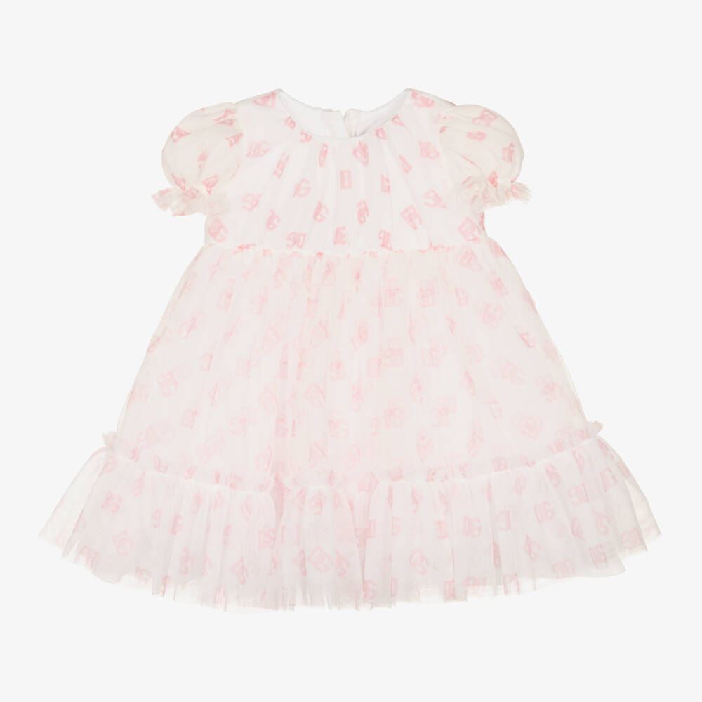 Baby girls white tulle dress by luxury brand, Dolce & Gabbana. The soft tulle overlay has a pink crossover DG logo for an all-over designer statement look. The fabric is soft to the touch and the design has a fitted bodice with cute puff sleeves with frill detail. There are tulle underlayers for volume and a super soft cotton and silk jersey lining for comfort. A pair of matching knickers are also included to cover nappies.