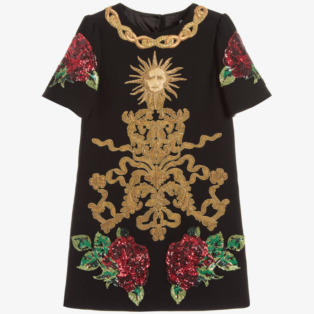 Made in Italy by Dolce & Gabbana, this beautiful black dress is made in a luxurious viscose crêpe. The stunning embellishments of twirled threads, sequins and beads contrast perfectly with the black fabric. For extra designer style and the perfect finishing touch to this elegant dress, the concealed popper fastenings are covered with button details, each with a different look.