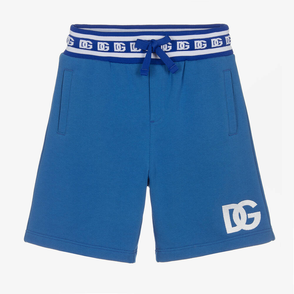 Casual bright blue shorts for boys from luxury Italian brand Dolce & Gabbana. This cool oversized style is made in soft, looped back cotton jersey with two front pockets and one one the back. The iconic DG logo is embroidered in white by the hem, and featured on the elasticated jacquard waistband, adding a luxury touch to this casual wear. Practical and easy to pull on, the drawstring is adjustable for a good fit.