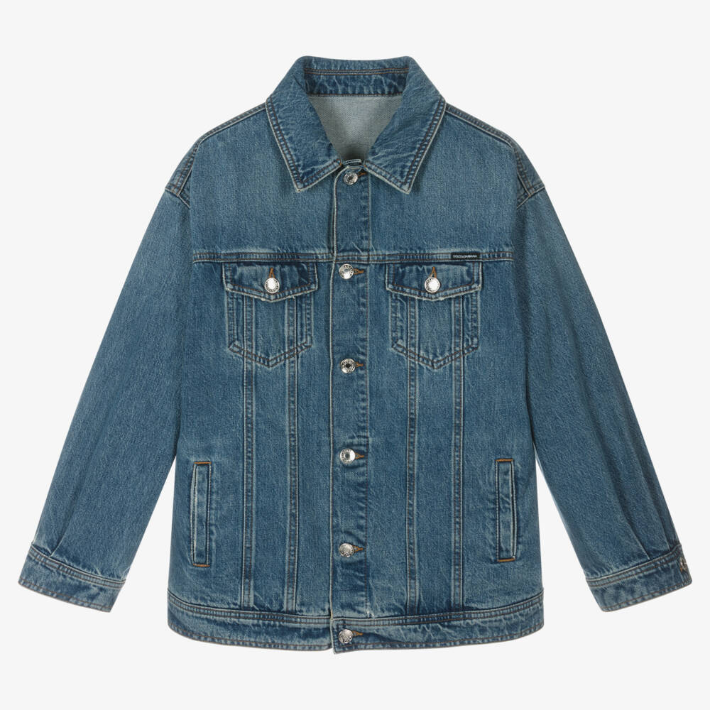 With a large beige velour logo appliqué on the sleeves and across the shoulders, this denim jacket for boys is unmistakably by luxury Italian label Dolce & Gabbana. Further branding can be found on the shiny silver button fastenings on the front, pockets and cuffs, as well as on a logo tab on one side. Casual and relaxed, it has a washed and worn look.