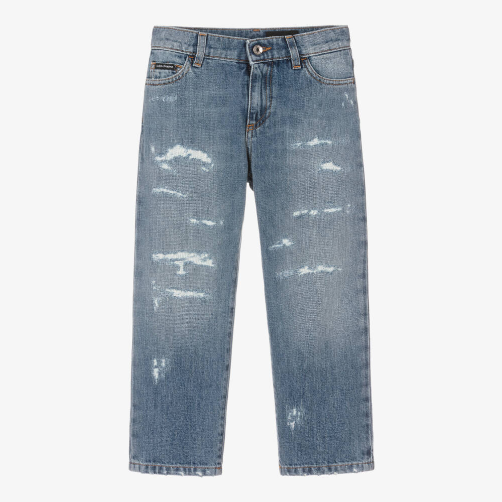 In a relaxed Dad fit, these mid-blue jeans for boys by luxury label Dolce & Gabbana are inspired by the main collection. With a cool, distressed look, they have a monochrome logo badge embroidered on the front coin pocket and a logo plaque stamped on the back. A red embroidered trim on one back pocket gives a laidback feel, and they have an adjustable waist for the ideal fit. This updated wardrobe staple adds a touch of luxury to your little boy's wardrobe, and they are finished with a logo embossed button and zip.