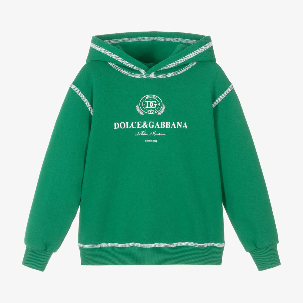 Sporty green cotton hoodie for boys by luxury Italian brand Dolce & Gabbana, with a white crest DG logo embroidered and printed on the front for instant brand recognition. Made in soft, stretchy, sweatshirt jersey with white overstitch detailing and long sleeves, the hood is lined for comfort and there are cosy, ribbed trims.