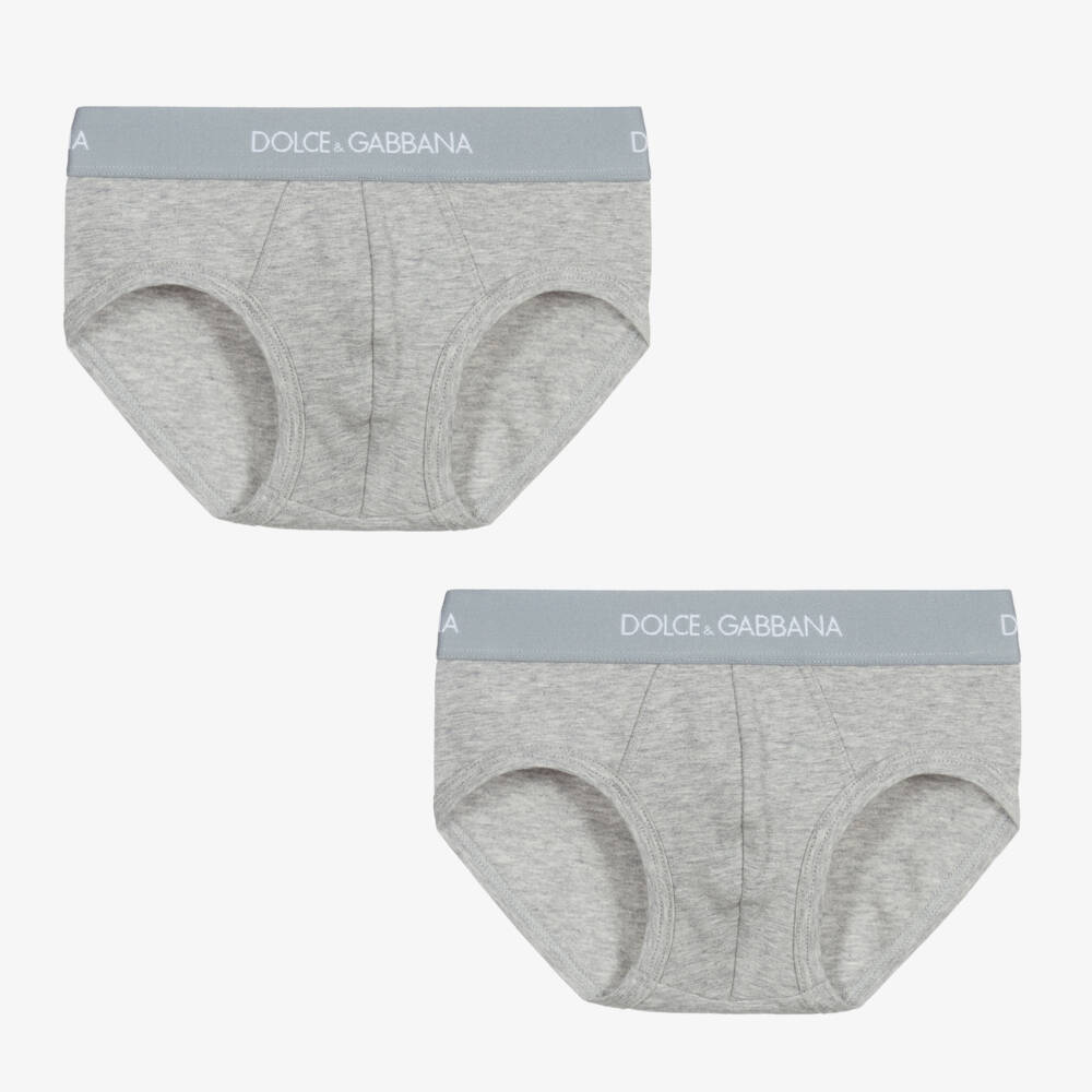 Pack of two grey cotton jersey pants for boys by luxury Italian brand Dolce & Gabbana. They have a comfortable elasticated grey and white logo waistband, and come in a branded box.