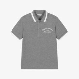 Ivory cotton polo shirt for boys by Dolce & Gabbana, with a navy blue '2012 Milano Dept' logo embroidered on the chest for a distinctive look. A classic style for everyday wear, it is made in soft, comfortable piqué, with a buttoned placket and side vents. The ribbed collar and cuffs are striped in navy blue for a smart finish.