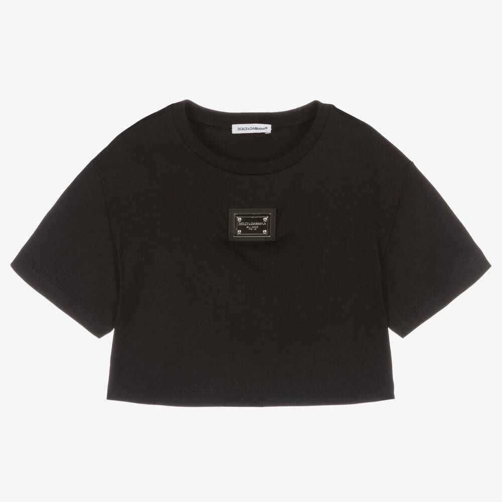 Cropped black T-shirt for girls by luxury designer Dolce & Gabbana, inspired by the adults collection. Made in soft cotton jersey, it has a silver logo plaque on the front for a luxe branded detail. This boxy tee adds a touch of luxury to your child's casualwear collection.