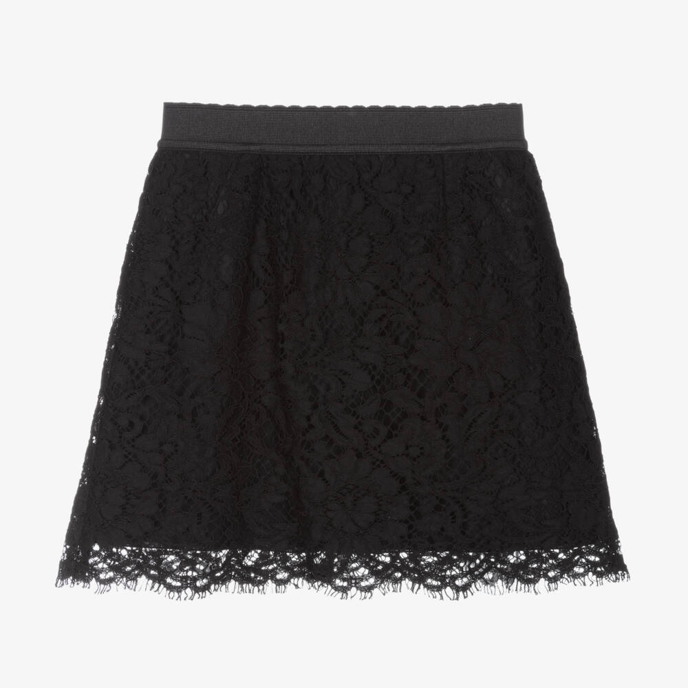 Black lace skirt for girls by Dolce & Gabbana. Made in beautiful, intricately detailed lace with a layer of tulle underneath, the pretty, scallop-edged hemline has been left unfinished with raw edges which will likely fray, giving the item an expected worn effect. It has a silky soft viscose lining, an elasticated waistband, and a zip fastening on the back.