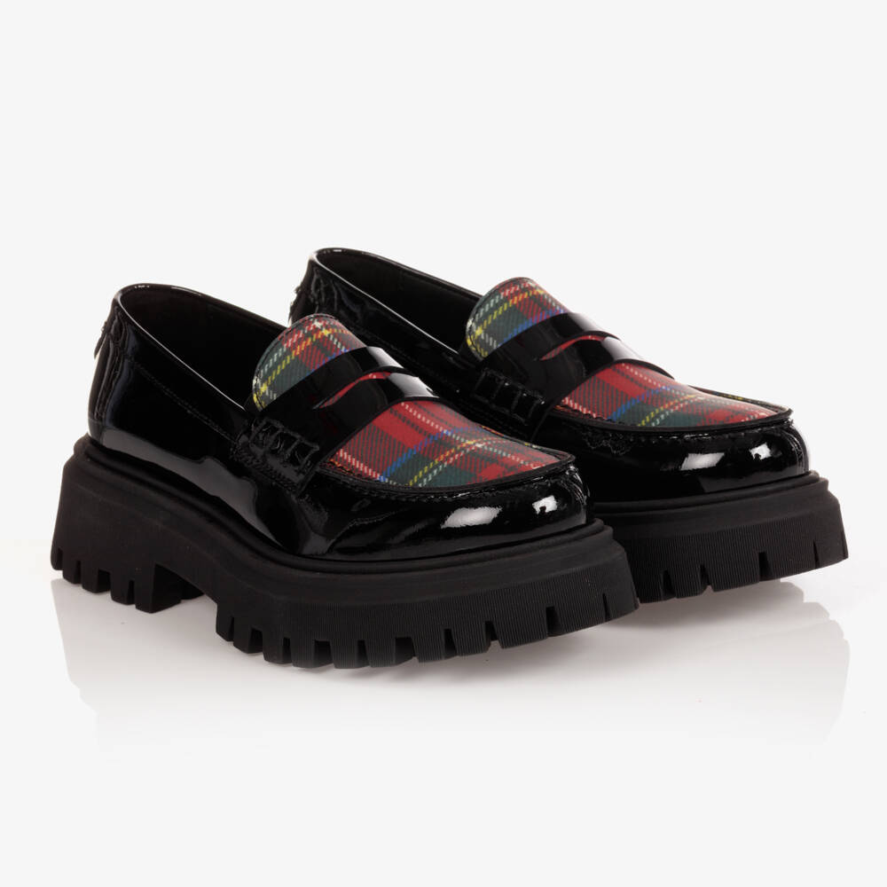Sleek, black patent leather loafers for girls by Italian designer Dolce & Gabbana, with colourful tartan check print leather panel. The distinctive metal DG logo branding in silver finish can be seen on the heels for a little luxury touch. Lined in soft leather with a lightly padded insole for comfort, the chunky rubber lug soles give these classic loafers an on-trend vibe.