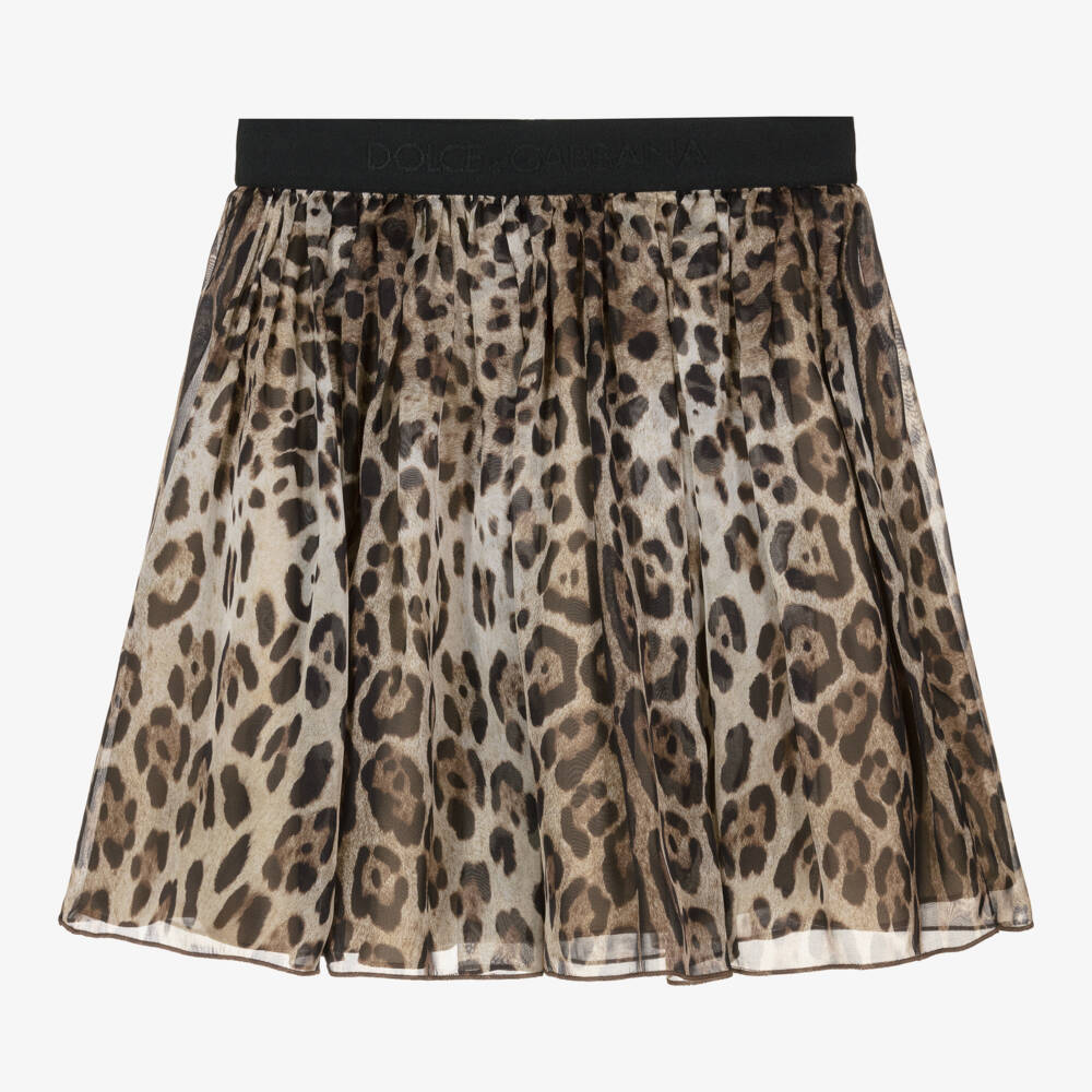 Brown, black and beige skirt for girls by Italian luxury designer Dolce & Gabbana, designed in an iconic leopard print. Crafted from luxurious and lightweight silk, this floaty skirt is fitted with an elasticated black waistband with the designer's name incorporated into the weave. There is a concealed zip fastening on the back and a gold, viscose satin lining for superior comfort.