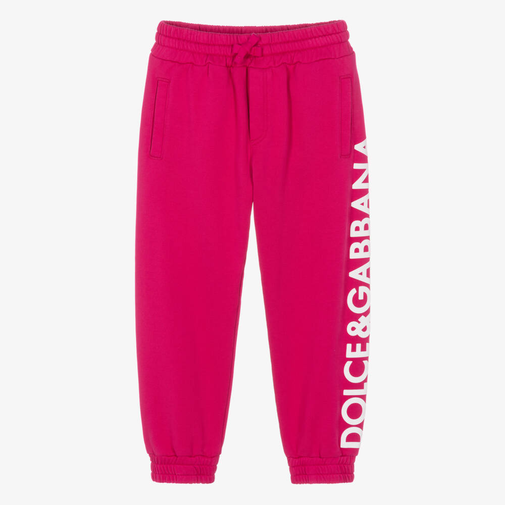 Fuchsia pink joggers for girls by luxury Italian brand Dolce & Gabbana, made in soft mid-weight cotton jersey. In a regular fit, these casual trousers have useful front pockets and a bold white logo print on one leg for an unmistakable designer look. They have elasticated cuffs and a stretchy drawstring waist for an adjustable fit.