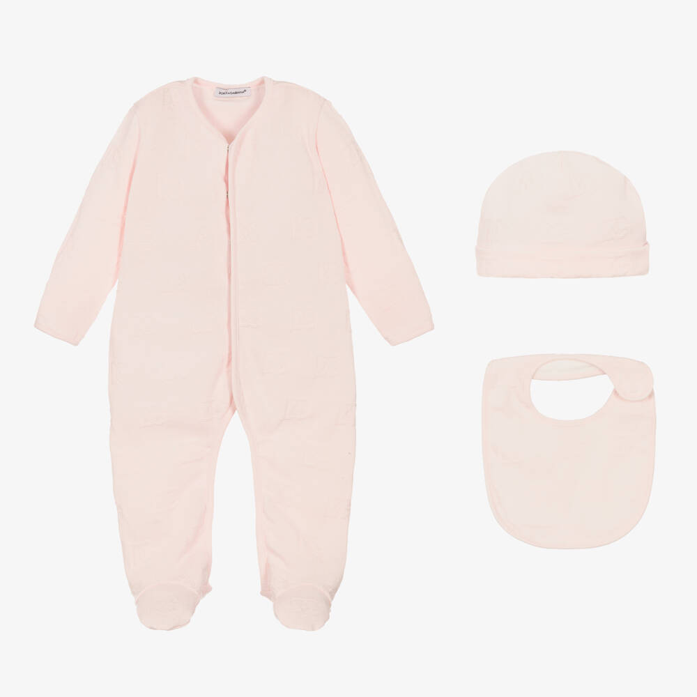 Luxury three-piece pink babysuit gift set by Dolce & Gabbana. Finely knitted in soft cotton, the stretchy fabric has a raised crossover logo jacquard DG pattern. The onesie has concealed front popper fastenings and fold-back cuffs. The matching bib has a white towelling reverse and popper fastening at the neck. The set includes a matching layette hat and comes presented in a gift box.
