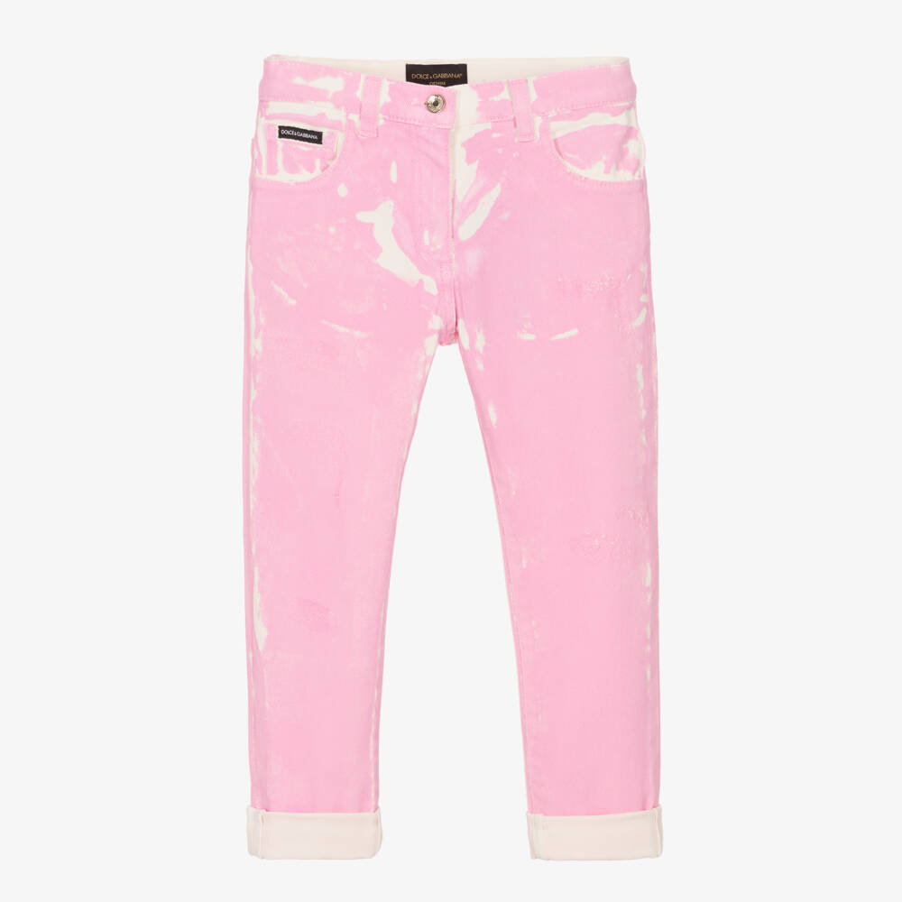 Unique pink denim jeans for girls by luxury Italian designer Dolce & Gabbana. Made to look painted, these cool distressed jeans have five-pocket detailing with a subtle logo patch on the coin pocket. They have fixed turn-up cuffs, a branded button and zip fastening, and an adjustable waistband. There is also a metal and leather logo plaque on the back pocket for a signature finish.