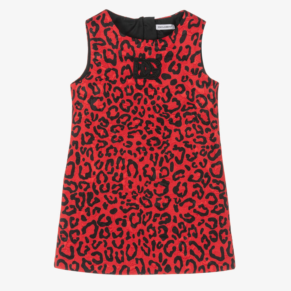 Fabulous red shift dress for girls by luxury Italian designer Dolce & Gabbana, with an eye-catching black leopard print. Made in sumptuous, mid-weight jacquard, it has the brand's cross-over logo on the front in black satin. Fully lined in soft satin for comfort, it has a discreet, concealed zip fastening around the back.