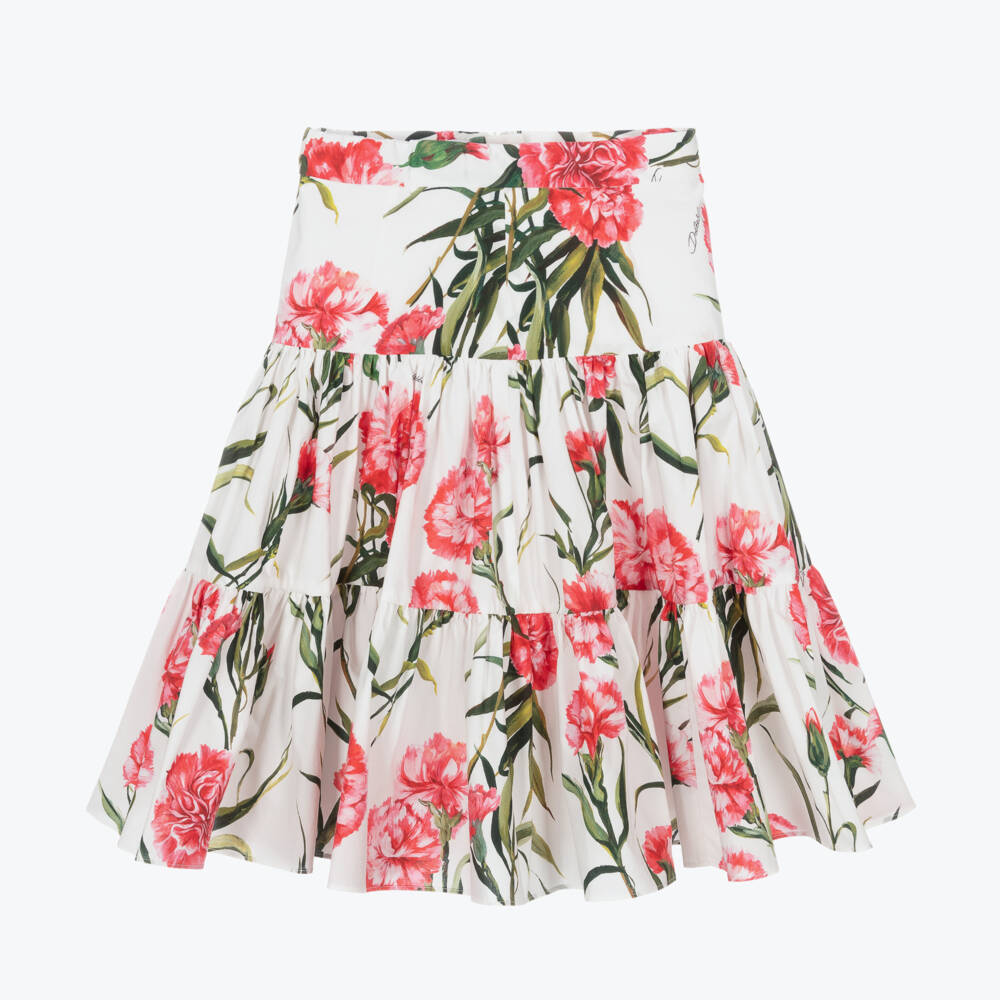Beautifully patterned with pink and green carnation flowers, this white skirt for girls is from luxury Italian designer, Dolce & Gabbana. Inspired by the main collection, it is made from fine cotton poplin and falls in gathered tiers creating a feminine silhouette. A concealed zip fastening on the side gives a neat finish and the waistband is adjustable for a comfortable fit.