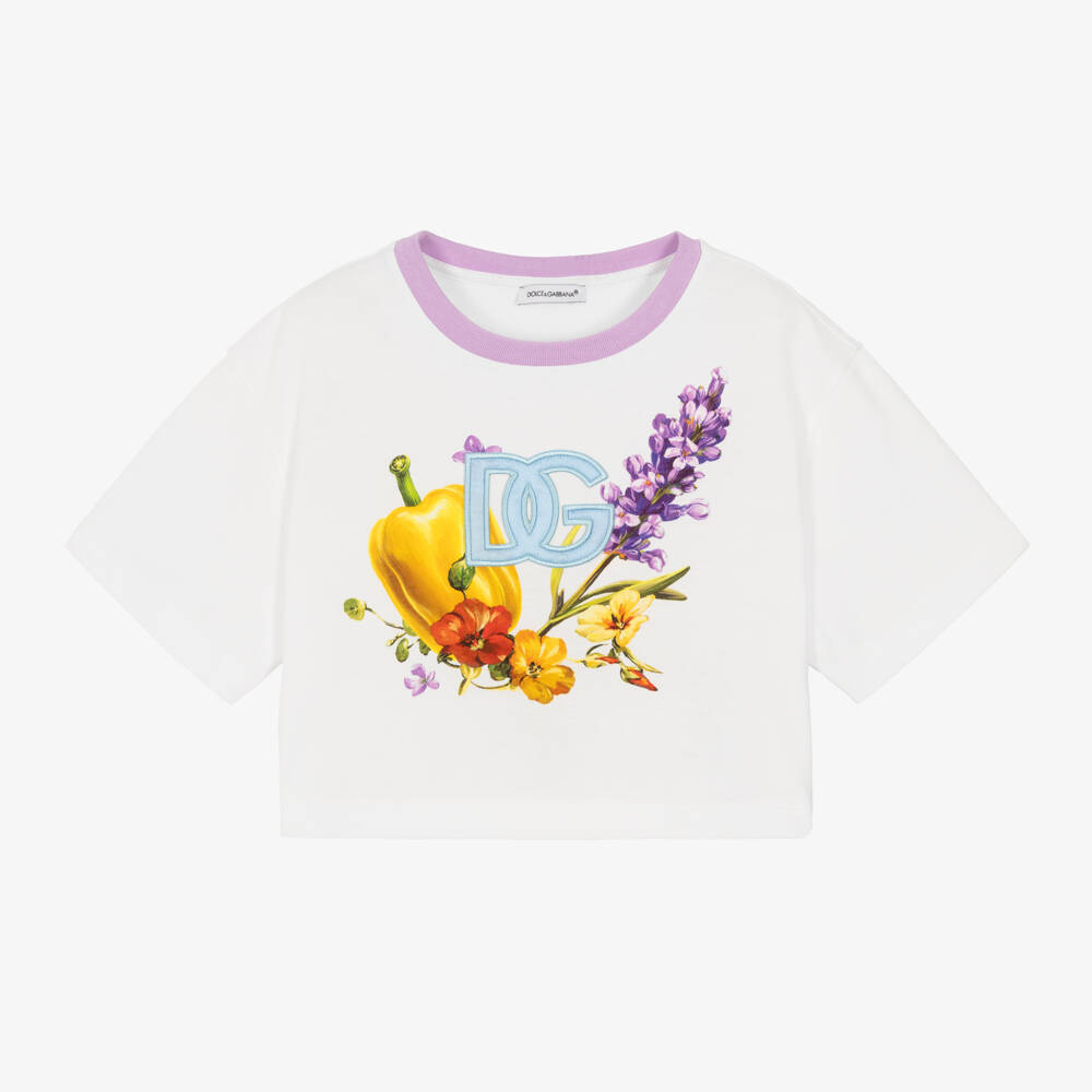 A boxy white T-shirt for girls by luxury Italian designer Dolce & Gabbana. Inspired by gardening, it has a colourful vegetable and flower print on the front and a lilac purple ribbed neckline. The light blue crossover DG logo appliqué on the front lends a signature touch.