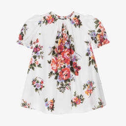 A gorgeous white maxi dress for girls by luxury designer Dolce & Gabbana. Light and floaty, it is made of smooth cotton with an iconic colourful floral and logo print. The front has red decorative buttons with a DG monogram and there is a zip fastening on the back.