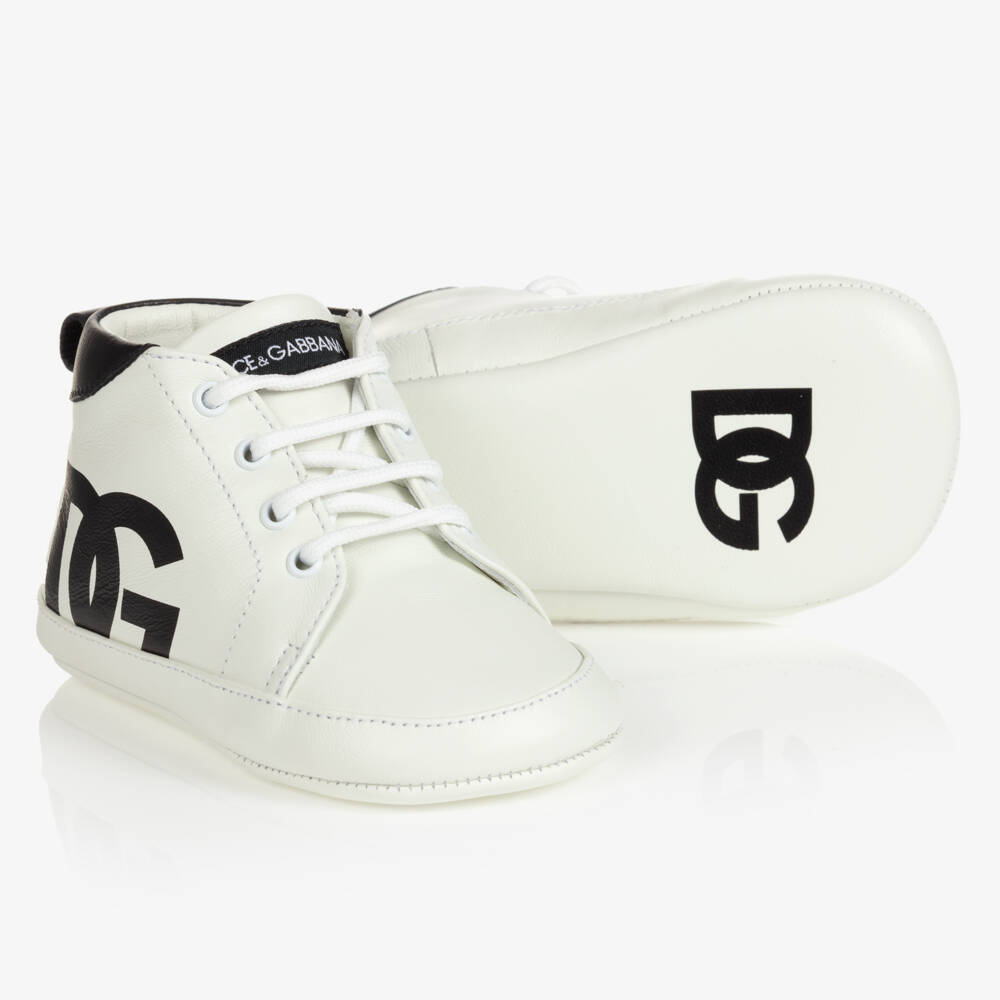Off-white with black trims, these pre-walker high-top trainers for baby boys are by luxury Italian brand Dolce & Gabbana. Made in soft leather, they have signature crossover DG logo prints in black. There are comfortable leather insoles and outer soles, with lace up fastenings for the ideal fit.
