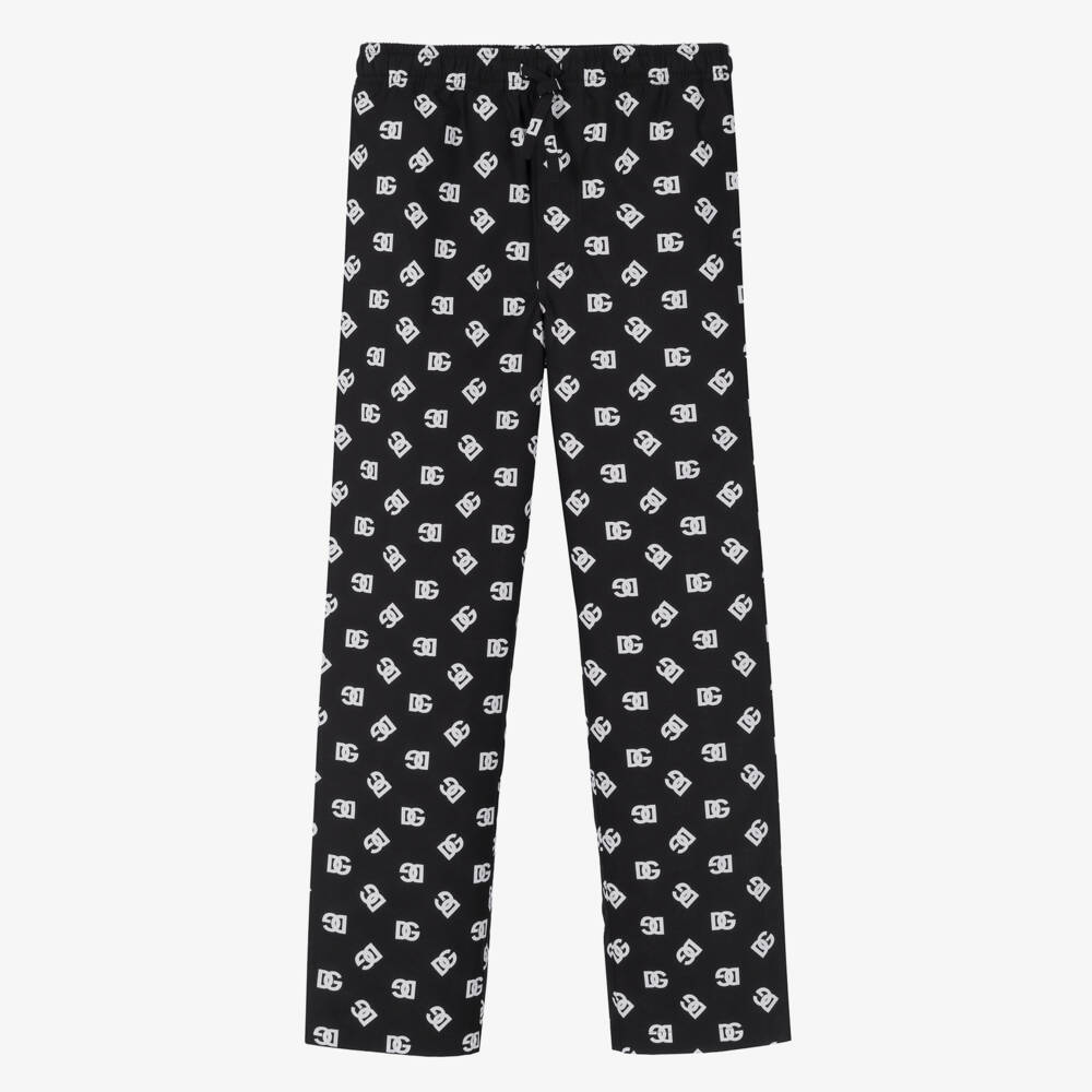 Black logo-inspired trousers for teen boys and girls, by luxury fashion house Dolce & Gabbana. Modern and innovative, they have a bold crossover DG logo design all-over, with white trims decorating the sides, and three-pocket detailing. In a relaxed pyjama style, they are exquisitely cut from cotton poplin, and are finished with a drawstring for supreme comfort.