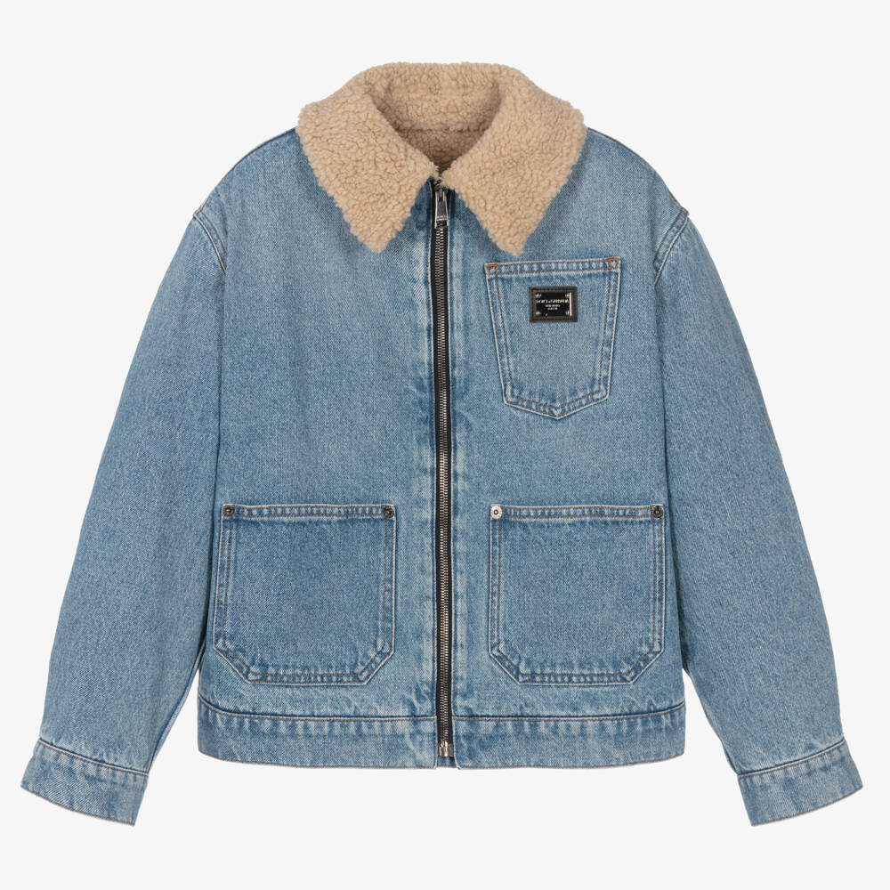 Cool and casual blue denim jacket for teen boys by luxury Italian fashion house Dolce & Gabbana. The collar and lining is in soft sherpa fleece for cosy comfort and warmth. Fastening with an exposed zip on the front, the jacket has three pockets, two trimmed with branded rivets and one with a branded metal plate for a signature finish. The sleeves are lightly padded and the hem has adjustable button tabs for a comfortable fit.