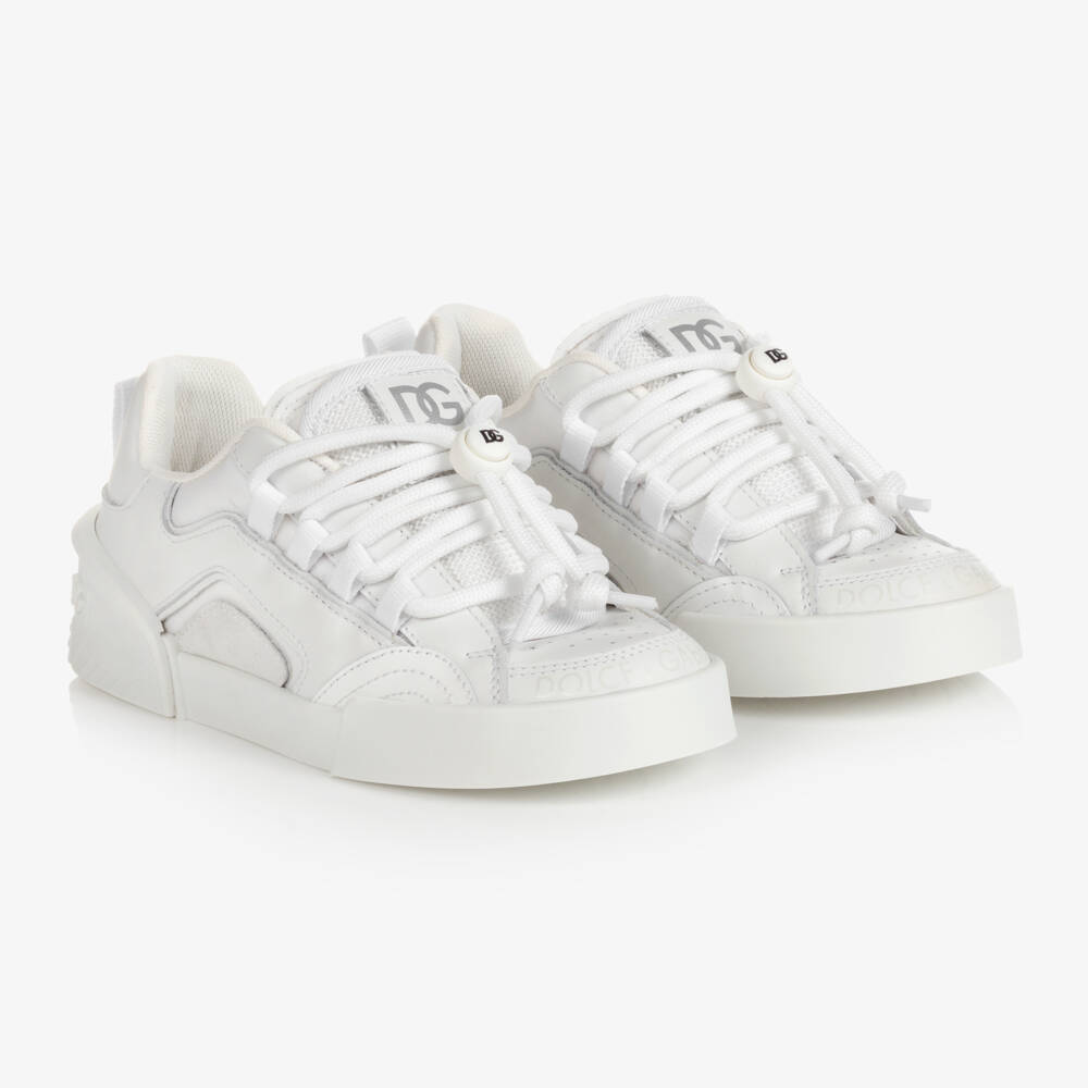 A bold pair of white leather trainers for teen boys, by luxury brand Dolce & Gabbana. Modern and futuristic, they have textile detailing, with the eye-catching silver crossover DG logo on the tongue. The laces contribute to the streetwear vibe, while fastening conveniently with a logo-embossed toggle. There is a lightly padded lining, a breathable leather insole and a non-slip rubber outsole.