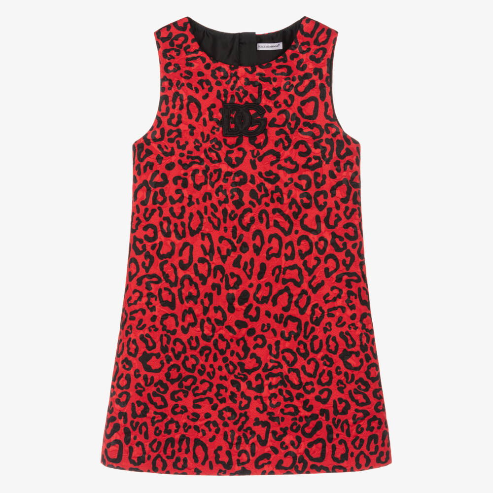 Fabulous red shift dress for teen girls by luxury Italian designer Dolce & Gabbana, with an eye-catching black leopard print. Made in sumptuous, mid-weight jacquard, it has the brand's cross-over logo on the front in black satin. Fully lined in soft satin for comfort, it has a discreet, concealed zip fastening around the back.