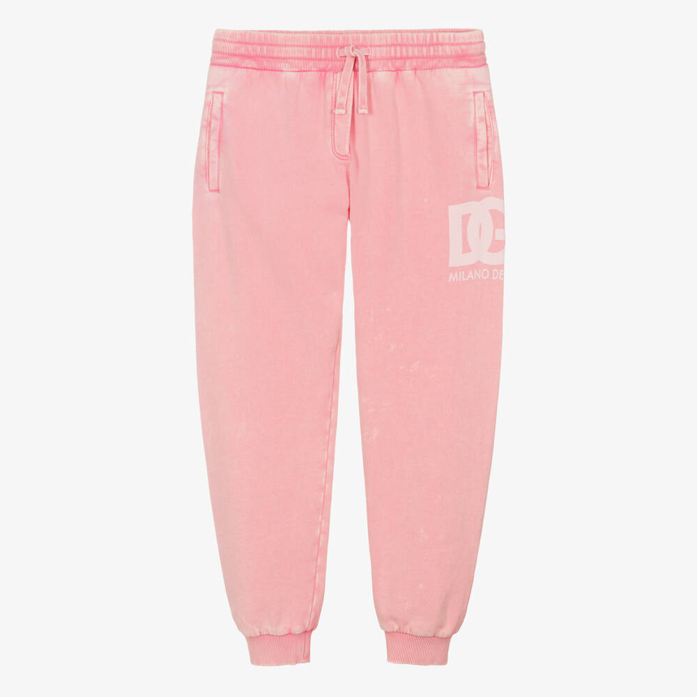 Pink acid wash joggers for teen girls from luxury Italian label Dolce & Gabbana, signed with a crossover DG logo on the front. With a vintage vibe, these comfortable joggers are made in mid-weight cotton jersey with ribbed ankles and recognisable white logo lettering on the back. Front and back pockets, along with a drawstring waist complete this casual, athleisure look.
