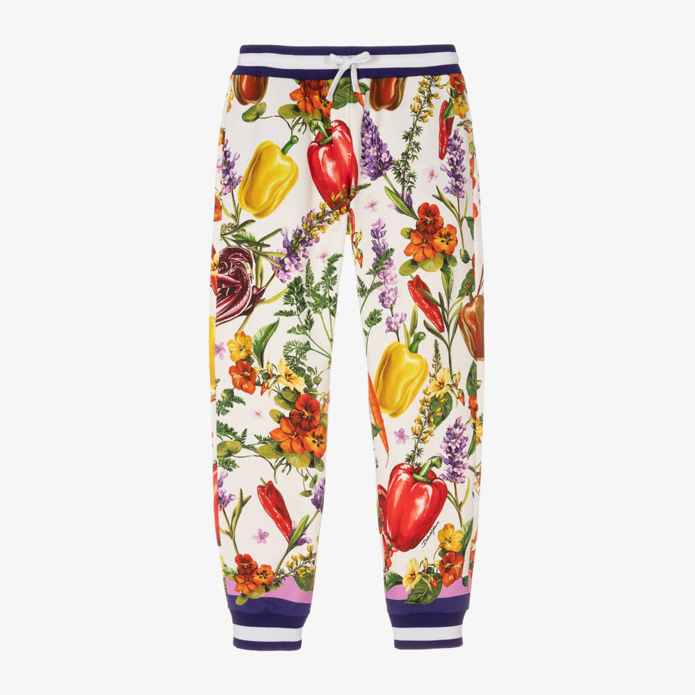 Charmingly casual white joggers for teen girls, by luxury Italian designer Dolce & Gabbana. Reminiscent of the Sicilian garden, these joggers are patterned in rich Mediterranean floral vegetables for a delightful farmer girl vibe. They are subtly signed with the brand's signature script logo throughout, adding designer distinction. Made from the softest cotton jersey, there is an adjustable drawstring waist, with ribbed trims and side seam pockets.