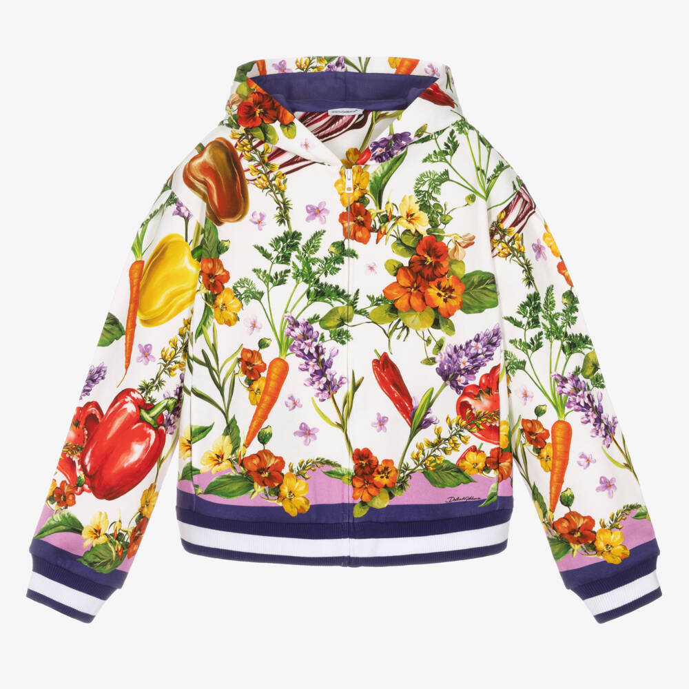 From luxury Italian designer Dolce & Gabbana, white and purple zip-up hoodie for teen girls. Patterned with a colourful vegetable and floral print inspired by a charming Sicilian garden, this comfortable mid-weight cotton jersey top has tonal purple and white ribbed trims for a sporty look. It is unmistakably D&G and offers a touch of luxury to a casual item in a playful way.