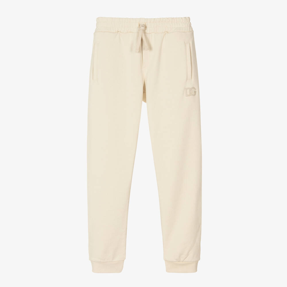 Oversized beige joggers for teen boys and girls by luxury Italian brand, Dolce & Gabbana. Made from mid-weight organic cotton jersey, these relaxed cuffed joggers have a stretchy drawstring waist and useful pockets on the front and back. For a subtle designer finish, there is a tonal crossover DG logo appliqué on the front.