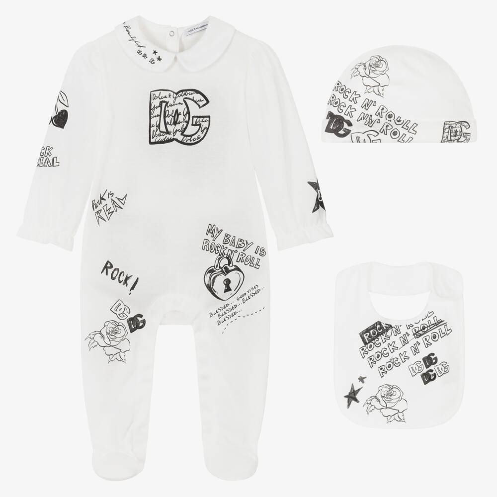 Adorable three-piece luxury gift set for baby girls by brand Dolce & Gabbana. In off-white, with mismatched black DG logo and Rock n' Roll themed drawing prints, the set includes a babygrow, a hat and a bib. The babygrow has a sweet rounded collar and practical popper fastenings. The bib has soft towelling lining and popper fastening on the side. All pieces are made in soft and comfortable cotton jersey and presented in a smart gift box.