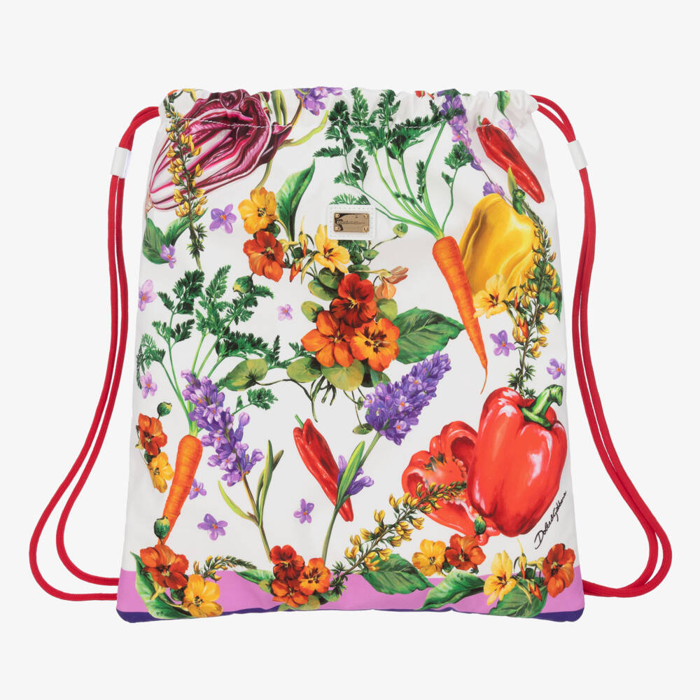 A white and red cotton drawstring backpack for girls from Dolce & Gabbana. Renowned for their richly decorated patterns, the designer celebrates the vibrant Italian garden with gorgeous floral and vegetable prints. A golden metal logo plate set on white leather is stitched on the front, and the label's script logo is accented within the pattern for instant designer recognition. This Italian-crafted bag is woven in soft-yet-sturdy poplin, and opens to reveal a silky lining.