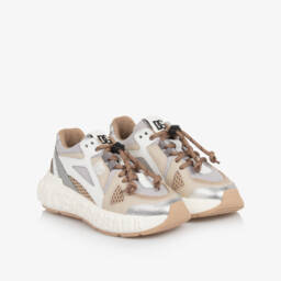 These white and pink trainers by luxury Italian brand Dolce & Gabbana, offer a stylish and comfortable choice for girls. Made in soft, breathable mesh with leather and metallic pink trims, they have signature logo detailing on the tongue and side. The sporty tubular laces fasten with a cool toggle for a secure fit. The chunky rubber sole features a raised logo on the side and provides excellent grip and support.